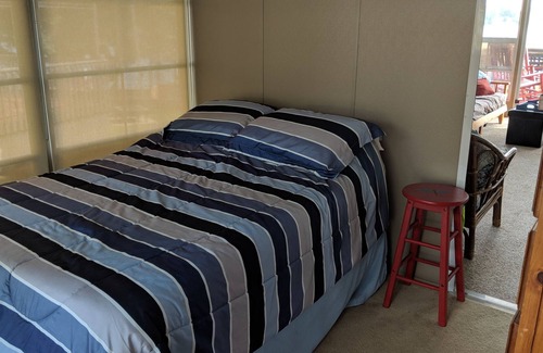 • Master bedroom has a queen sized bed, second bedroom has a double, third bedroom in the sunroom has a double, pull out coach in the living room with a double and a futon in the sunroom