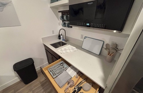We welcome you to enjoy a private sanctuary located in Gossamer Grove, a newly constructioned neighborhood that is peaceful and safe. This one bedroom apartment suite is a great place for family or professionals. There are multiple parks inside the community and offer anything from a game of pickleball, basketball, tennis or a nice leisurely walk or jog on one of the walking paths nearby. Two of the parks offer outdoor exercise equipment as well. The home is conveniently located near the 99 and 5 freeways, minutes from the Meadows airport and 10 minutes away from downtown Bakersfield. The space is a 1 bedroom apartment suite attached to our home, but completely private with a separate entrance.Guest access-Keyless entry with a code that changes with each reservation. Other things to note-We provide a fully stocked coffee/tea bar to start your morning off right! Kitchenette is stocked with every thing you will need in order to prepare meal with granite countertops, a convection microwave, hot plate, fridge/freezer, ice/filtered and chilled water dispenser, garbage disposal, dining and cookware - including wine glasses!-Living room has a smart television to stream your favorite apps and a couch with a queen-sized pull-out bed (extra bedding and pillows provided). There is a remote controlled fireplace for those chilly evenings. The coffee table pulls up to double as a workstation or a spot for snacks while you watch your favorite movie.The bedroom contains a queen-sized bed and walk-in closet.There is a desk workstation that can also double as a vanity, with a mirror above. There is one bathroom with a shower, toilet, sink, plenty of towels, and amenities - shampoo, conditioner, body wash, body lotion, makeup towelettes, hair dryer, cotton rounds, toothbrush and Qtips. Full size washer and dryer with laundry soap and fabric softener. Plenty of street parking directly in front of your apartment suite and on the side. Our place is equipped for both long or short stays to make your holiday one to remember.