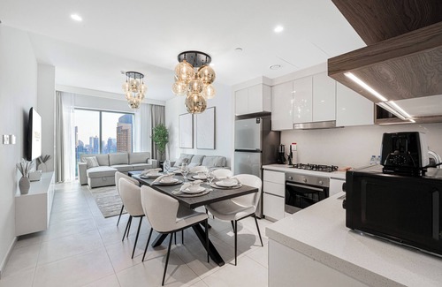 Mellas Holiday Homes welcomes you to The Oro Dubai, a stunning 2-bedroom apartment perched on the 34th floor of a prestigious building in Downtown Dubai. Each room boasts breath-taking views of the city’s most iconic landmarks, including the Burj Khalifa, The Address Sky Views, and Dubai Mall, allowing you to immerse yourself in the panoramic skyline at every moment. Designed for both leisure and business travellers, this apartment seamlessly blends luxury with top-tier amenities, ensuring an unforgettable stay in Dubai.