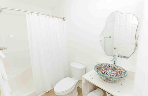The full bathroom offers a haven of relaxation, featuring a shower, toilet, and sink. Fresh towels and complimentary toiletries are provided, allowing you to pamper yourself after a day of outdoor exploration.