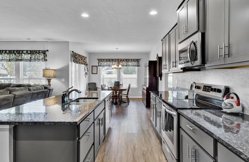 Chickadee Retreat is a single level home in a family friendly neighborhood tucked in Star, Idaho away from the hustle and bustle. The family room features a large sectional recliner couch plus an additional recliner. The big screen tv is perfect for movie nights, sporting events, or catching up on the latest news. The office space with double doors should make remote work or school a breeze. The home sleeps 7 with a King in the Primary, Twin trundle in the second bedroom, and then a Twin over Full bunkbed in the third bedroom. The Primary bedroom mattress is adjustable making it easy to find comfort for both sleepers' individual preferences (Sleep Number). The quaint backyard has a nice covered patio and grill. The neighborhood features a park within walking distance from the home that has a playground, pond, walking path, outdoor exercise equipment, and an extensive area of grass to play!