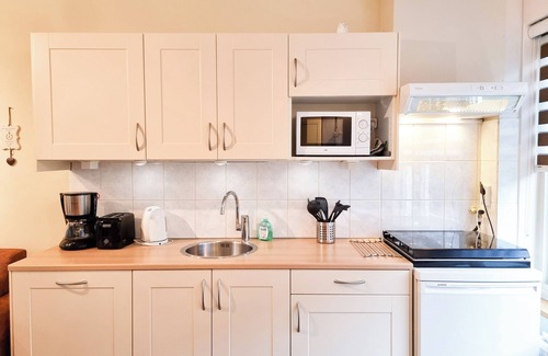 Prepare a home-cooked meal in the kitchen, complete with an oven, a stovetop, and a refrigerator, as well as a coffee maker, an electric kettle, and a microwave. Other amenities include bed sheets, heating, and a dining table.