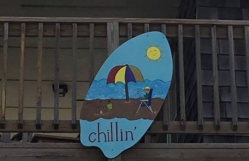 Chillin has a covered porch with east/ west views, 1 block over from the beach. Two high wooden adarondack chairs under cover allow you a peak at the ocean while you’re drinking your morning coffee or enjoying an evening cocktail .