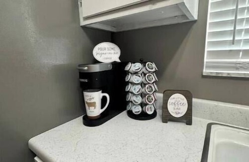 Grab your morning coffee from the coffee station with Keurig coffeemaker, starter K-cups, sweeteners, and creamers.