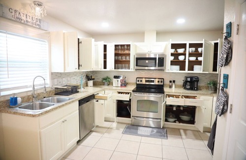 Cheerful and updated 2,000 square foot, 4 bedroom 3 bath residential home that was built in 2019. Property offers short-term shared space rental options with free parking. Property is clean and updated, and beautifully furnished with an airy and tropical beach style. Even though we do allow pets, there are additional rules and fees. We have 4 large bedrooms available with a shared common space: Laundry Room, Fully Stocked Kitchen, Living Room, Office Room with (2) computer desks and chairs and a printer, fenced-in back yard with patio furniture. Property also has audio and video recording devices located in the common area and exterior of the home for added security.