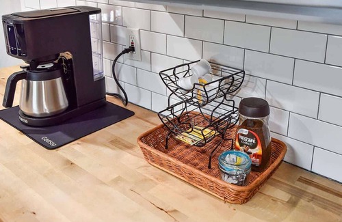 In the kitchen, you'll find everything you need to whip up a delicious meal. It features a gas stove, a knee bar with two stools off a butcher block countertop, and an awesome coffee station for coffee lovers. There's a spice rack, toaster, blender, plenty of cooking tools, and more. If you find something missing, just let us know, and we'll provide it within reason.