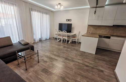 Located in the city center, this modern 2-bedroom, 2-bathroom apartment offers a stylish and comfortable stay. The spacious living area leads to a private terrace, perfect for relaxing. Both bedrooms are elegantly furnished, and the fully equipped kitchen adds to the convenience. Guests benefit from secure courtyard parking, making it ideal for those traveling by car. With shops, restaurants, and attractions just steps away, this apartment provides the perfect base for your city stay.