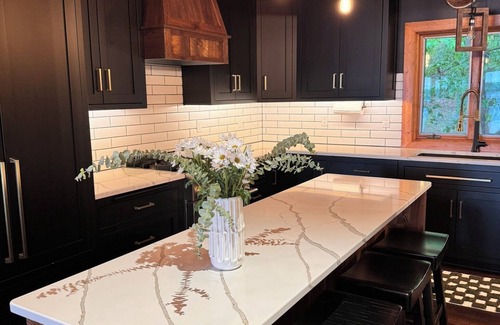 The property has a main cabin with two bedrooms (one king, one queen) and a large open loft with sleeping accommodations for six guests (two full beds, two twins) as well as a camp-themed cozy play area for younger guests. The large, main floor bathroom has a glass walk in shower, double sink and heated tile floors.