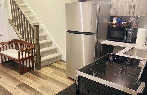 Private entrance to basement. Cozy room with queen bed, living room with 55" smart TV & beautifully decorated. Kitchen equipped with SS appliances, microwave & LOTS of cabinet space. Includes essential cookware, dish drain, dishware & cutleries. Fibre optic WiFi, AC and heating. There's free street parking for guests.