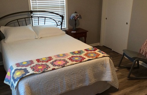 Renovated in 2019. Located in a quiet residential neighborhood. Open floor plan. Appliances, cabinetry, flooring replaced during renovation. Two bedrooms, one with king & one with queen. Queen bed has adjustable head & foot. One bath, walk-in shower with grab bars & built-in seat, double sinks in vanity. Dedicated quiet office space with desk & chair. 60" tv, WiFi, cable, Netflix & Youtube. Washer & dryer. Garage available for storage of items one might want secured ($75 refundable deposit for automatic garage door opener). Driveway space for four vehicles. Fully equipped kitchen, table seats six. Towels, sheets, pillows, blankets are furnished. Hair dryer, iron & ironing board furnished. Smoke detector, carbon monoxide detectors & fire extinguisher in house.