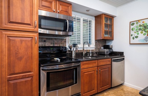 The living room area is highlighted by sliding doors which lead out to the deck. Watch the golfers tee off on the 8th hole of Ocean Winds Golf Course. Comfortable seating is arranged to take advantage of the view and also watch your favorite shows on the HDTV. The sofa is a sleeper. The dining area is adjacent to the living room with table and has seating for four at the round table and two bar stools at the breakfast bar.. A built-in bar offers is the perfect spot to whip up an evening beverage! The well-stocked kitchen opens out to the dining area and the living area. You have custom cherry cabinets and granite counter tops.