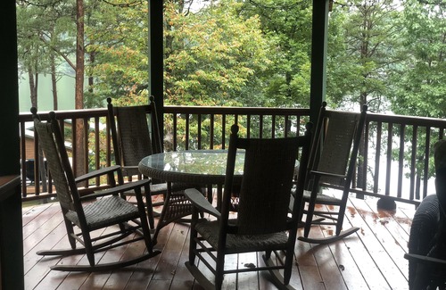 Enjoy a Smith Mountain Lake vacation in a beautiful lodge-like home. The timber rafters and gorgeous stone fireplace are exactly what you dream of when you think of a mountain/lake retreat. The furnishings are comfortable and will make you feel like home. Your morning coffee, evening dinners and even games can be played on the spacious deck outfitted with several "Kennedy" rockers or deep-cushioned chairs. If that's not enough, just wait until you get down to the huge dock! The main attraction is the giant u-shaped bar that is the envy of every boater who drives by. The comfy bar stools and 6 lounge chairs will offer a choice seat for everyone in your group.