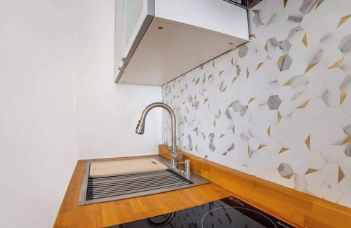 Cozy and recently renovated, this relaxing studio can comfortably accommodate a couple or up to two guests... It has a kitchenette with microwave and induction cooker, a sink, a small mini-bar, and modern shelving storage. It also features a dining table for two, Roku, and TV. This unique space also offers a queen bed as well as a full bath with a stand-up shower.