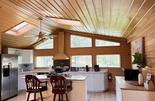Our cabin has a large open floor plan making it the perfect space for family and friends to spend time together. You can be cooking in the kitchen, while others are watching TV in the living room, playing board games in the dining room, and still all interacting together.