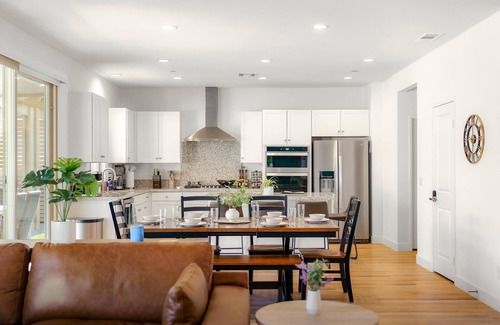 Begin your journey by parking your vehicle and stepping into a beautifully landscaped yard, a prelude to the tranquility that awaits you. With our seamless check-in process, simply enter your customized code to step into the grand foyer. Here, an expansive open floor plan greets you, with a living area and kitchen designed for relaxation and connection. The massive 75" 4k Luxury TV, visible from every corner of the living area, ensures you won’t miss a moment of game night fun.