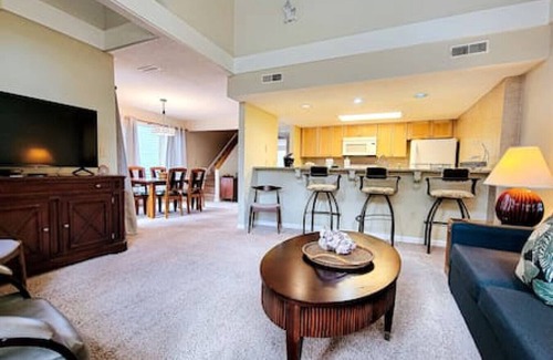 Upon entering this townhouse, a welcoming foyer provides an open and functional space with a coat closet and convenient half bath, accessed via stairs. The main level reveals a fully equipped kitchen seamlessly connected to an open living and dining area. Enjoy meals in the dining room with a private deck overlooking a tranquil lagoon. The dining area accommodates 6-8 people, while the living room features comfortable furnishings, including a queen sleeper sofa. A stacked washer/dryer adds convenience. The townhouse accommodates a maximum of 7 people.