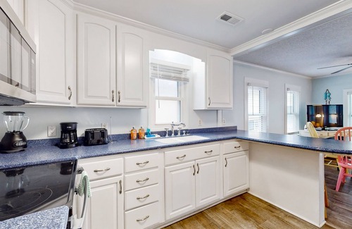 Inside Cottage #9, you'll find a Queen bed in the front bedroom, a set of Twin bunks in the back bedroom with an en suite bath, and a well-equipped kitchenette for all your culinary needs. While the kitchenette is compact, a shared washer/dryer room is conveniently located nearby for added convenience. The cottage exudes a cozy ambiance, making it a welcoming space to unwind after a day of beachcombing and exploring all that Kure Beach has to offer.
