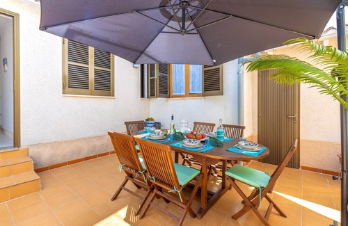 This charming, sun-drenched house located in the tranquil village of Son Serra de Marina, just steps away from the stunning sandy beach. Perfect for up to 6 guests, this beautiful home features two expansive terraces ideal for relaxing and outdoor enjoyment. The rooftop terrace is outfitted with three sun loungers for perfect sunbathing or leisurely relaxation, while the traditional Mallorcan courtyard offers a dining table with 6 chairs and a grill for unforgettable al fresco meals. The house boasts a spacious living and dining area with comfy armchairs, a large wooden table for 6, and a big TV for entertainment. The kitchen, set for renovation in spring 2025, is fully equipped with an oven and dishwasher. Two of the bedrooms offer comfortable double beds, and the third features a bunk bed. Additionally, there are two renovated bathrooms, one next to the bedrooms with a shower and another on the ground floor terrace. The living room and two bedrooms are air-conditioned, while the bunk bedroom is cooled by a ceiling fan and a curtain that connects it to the adjacent double room. This vacation home is perfectly situated in the picturesque Son Serra de Marina, where the beautiful beach and the village’s scenic coastline are just a short walk away. The village is also home to delightful beachside restaurants offering delicious meals with a refreshing sea breeze. Whether you're planning to enjoy the beach or explore nature, this house serves as an excellent base. Pets are welcome upon request, making it a great option for families or groups seeking a peaceful sun and sea getaway.