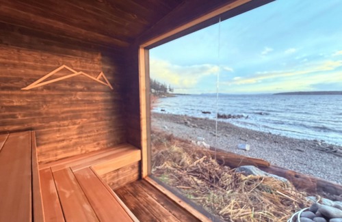 Relax and recharge with our glass-panel sauna, offering panoramic ocean and mountain views as you unwind in warmth. Watch dolphins feed in the cove, or spot the mist of passing whales in the distance.