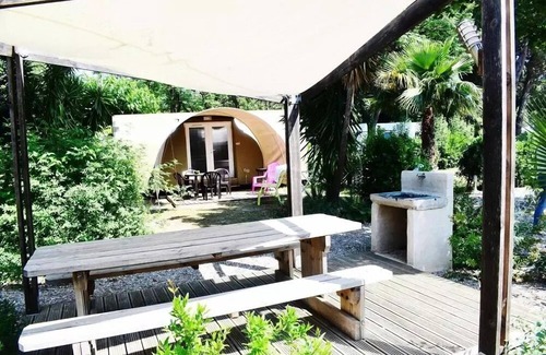 Accommodation: Coco Sweet is a new concept that is both functional and cosy, fun and cozy, all equipped. It is an intermediate solution more affordable than mobile home and more comfortable than tent. With a surface of 16m2, it can accommodate up to 4 people, it has 2 bedrooms (a double bed of 140x190 and 2 single beds of 80x190), an equipped kitchen corner and a covered terrace with garden furniture.Discover the space we created for the Coco Sweet, a haven of greenery reserved for pedestrians. In the centre you will find a large table to meet in the shade of a pergola and a fountain.As they are not connected to the water, they are located near the sanitary facilities of the campsite. Find the pleasure of camping with the comfort of a mobile home!Pillows and blankets provided. Think about bringing your sheets, toilet towels...For your comfort you have the possibility to choose different options when booking:- single-use disposable sheets- cloth towels- fabric sheets with made bed- baby pack (cot + high chair)In COCO SWEET our friends animals are accepted Hey!This rental is not air conditioned but 2 fans are provided!