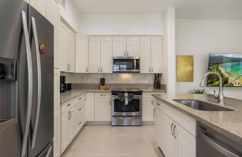 • Fully Equipped Kitchen: A chef's dream, the kitchen features modern appliances, granite counters, custom cabinetry, and stainless steel appliances, along with all the necessary utensils for your culinary adventures.
