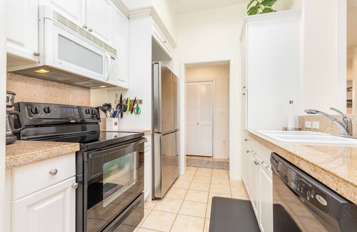 Gather around the dining space for shared meals, kick back with your favorite show on the flat-screen TV, or perch at the kitchen bar for coffee and conversation. The kitchen is fully outfitted with modern appliances, ample counter space, and everything you need to prepare fresh island-inspired dishes.
