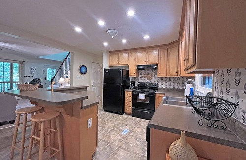 The interior of Colston Creek features three bedrooms, 2.5 baths. The living area is comfortable and inviting with comfy furnishings, flatscreen with streaming, and a gas log fireplace. The kitchen is fully stocked with ample dining space, both with large table and eat in bar. The primary bedroom is located on the main level, has a king sized bed, flat screen tv with streaming, work desk, and large walk-in closet. The primary bath has a large soaking tub, double sink vanity, & separate walk-in shower. For guest convenience, there is a half bath and full laundry on the main level. Upstairs, you will find two additional bedrooms, one with queen sized bed & tv, the other with two full sized beds, tv, and an ample amount of toys for children's entertainment. There is also a full bath with tub/shower combo.