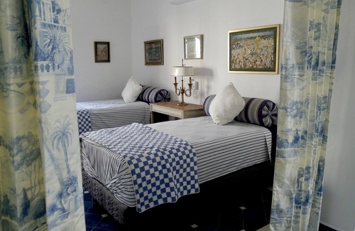 The Blue Casita is a luxurious comfortable small one bedroom apartment , all in blue and white, the living room with Netflix ,Wi Fi , AC and fans. A big sofa, good lighting ,three overstuffed chairs The floor,deep blue tile with an Indian dhurrie ..The kitchen is fully equipped and eating at the Bar counter.The blue /white twin bedroom has a smart black/white bathroom. And on the roof is a resort- blue and white pool and big white relaxing sun deck.