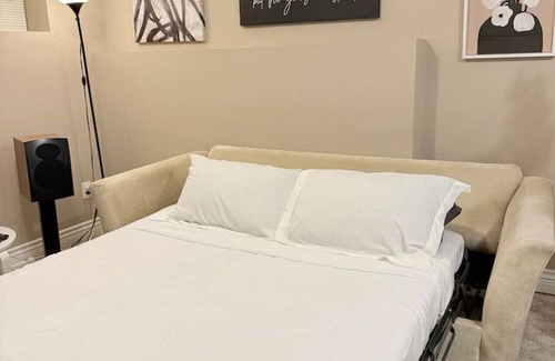 If you're looking for a clean, no fuss, cost-saving option for a family of 4-6, look no further! We offer a spacious 2 bedroom + sofa-bed basement suite in a safe neighborhood. We live above with our children who play classical instruments in the evening so people who are not sound-sensitive would be the best fit. Friendly, securely contained dogs on-site. Plenty of parking. Fully equipped kitchen. Wash/Dryer. A simple + effective place for your long or short term stay.