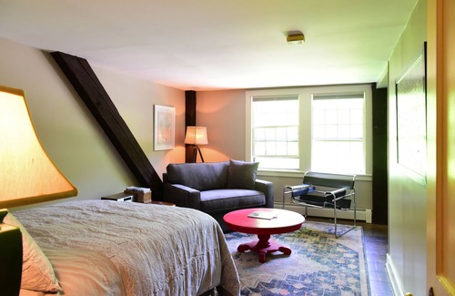 Small kitchen w/refrigerator, 2 burner hotplate, microwave & washer/dryer. Open living/dining area with beamed ceilings & A/C. 55" TV, CD collection. Not suitable for small children. No pets. Downstairs is a small restaurant. Gt. Barrington is 3.5 miles away.