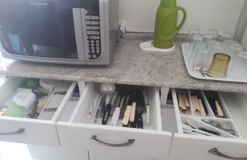 - Combined kitchen with dining area, in which it has: table with 6 chairs, 3 swivel stools, TV 20 ', duplex refrigerator, 4 burner stove, microwave, blender and full kitchen utensils (Plates, cutlery, glasses, shapes , pans, etc..).