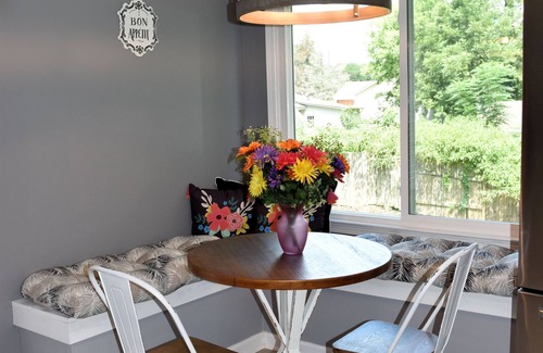 The kitchen is an integral part of the house, so we want to make sure we are providing you with a functioning kitchen. Here in the kitchen, you’ll find - a set of non-stick pots and pans, cooking utensils, strainer/colander, cooking shears, cooking stove, fridge, microwave, oven, cutting boards, dining ware set, and a Keurig coffee maker. Please feel free to have a morning coffee and breakfast in the kitchen nook in front of a large, oversized window.