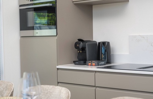 The cosy living room includes a seating area with TV, a dining table, and large windows that bring in plenty of natural light. The modern open kitchen is fully equipped with an induction hob with integrated extractor, combi oven, and dishwasher – ideal for relaxed cooking together.