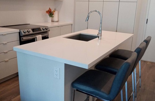 Inside, you'll find a cozy living room with a pull-out couch and Smart TV, a luxurious Queen-size bed, and a clean, sanitized bathroom. The fully equipped kitchen includes all major appliances and bar seating. Plus, there's an in-unit washer and dryer for your convenience. Book now and make yourself at home!