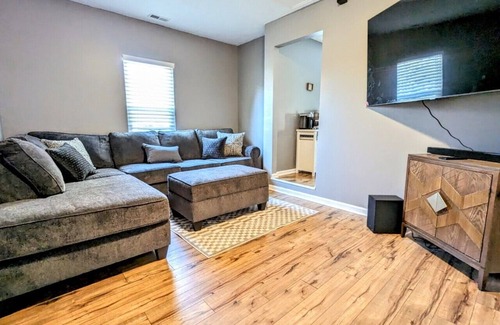 As you walk in to this adorable home, you enter into a large, spacious living room. The main living room has a large couch that can be used as an extra sleeping space. There is a 65" Smart tv with sound bar mounted to the wall.