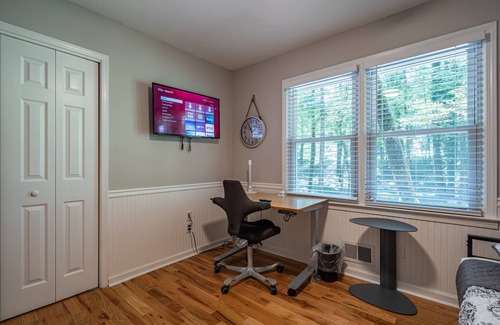 Enjoy a tranquil private experience just 4 minutes drive from the bustle of Downtown Alpharetta! This cozy single-level home is nestled in a quiet neighborhood and boasts two (2) King bedrooms and one (1) bedroom with a twin trundle bed and an ergonomically friendly desk/chair. You also get a Queen sofa bed in the living room. Venture out the back door to your fenced private backyard with outdoor dining for 4 and a super fun disc golf set to make lots of memories with!
