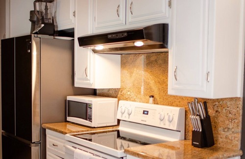 Come enjoy our relaxing, freshly renovated, mid-century modern condo that offers high speed Wi-Fi, self check-in, attached two-car garage w/ extra parking spaces, and a full kitchen suited for light cooking and baking.