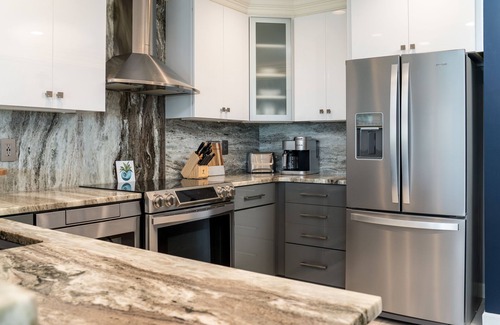 The second bedroom also has a king bed with updated full bath access. Both bathrooms feature beautiful tiled showers and granite vanities. There is a new, full size LG washer and dryer for your convenience.