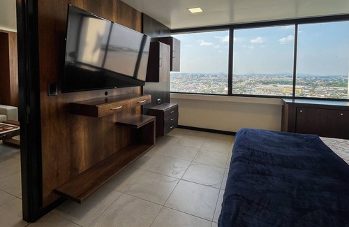 1 bedroom apartment close to the airport, located on the 16th floor at the Puerto Santa Ana tourist complex. At the foot of the boardwalk with a variety of bars, restaurants, attractions and mini markets. Partial view of the river and the city. King sized bed. 55-inch TV with Chromecast and over-the-air TV. Wifi. Washer/dryer machine. Work desk with a comfy executive chair. Airfryer. Coffee maker. Microwave. Ceramic cooktop. Free parking space inside building.