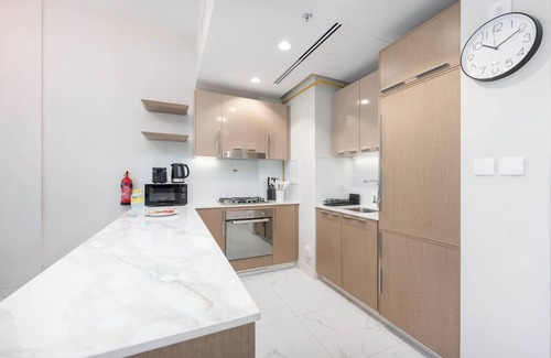 The apartment boasts a bright and airy atmosphere with a spacious open-plan dining and living area, complete with satellite TV. It’s perfect for unwinding after a day of shopping at Dubai Mall, just a 12-minute drive away. Step out onto the balcony to enjoy your morning coffee while taking in the serene greenery of Meydan.