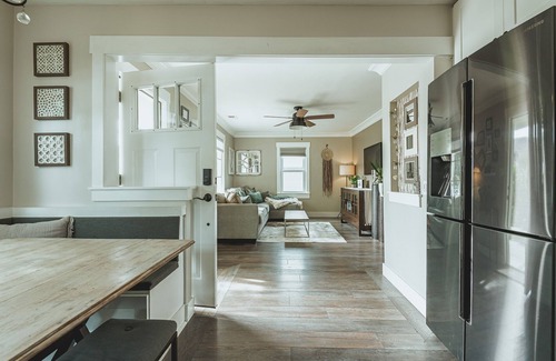 This quaint bungalow has earned the privilege of being invited into the Airbnb PLUS collection which only includes a handful of premier properties. The home features a fully-stocked modern kitchen with custom dining nook, quartzite countertops and high-end black stainless steel appliances. The open living area has a large sectional couch offering ample seating and a Samsung Frame smart television. There are comfortable queen-sized beds in both bedrooms with quality linens and down pillows. The 1st bedroom has another flat screen smart tv. The bathroom is adorned with limestone tile, a bathtub shower combo and a double vanity with marble countertops. Private off-street parking in the driveway as well as open street parking for additional vehicles. Laundry facilities on site in the detached garage.