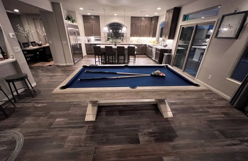 Delight yourself in Luxury in Southwest Las Vegas. This two story home was built in 2020 with a contemporary design located adjacent to Southern Highland. Upon entering you will find an elegant formal living room with formal dining room attached. Dining room table seats 8 people comfortable. There is a substantial size kitchen with large island, double oven and huge refrigerator fully stocked with all kitchen amenities. Just off the kitchen is the family room featuring a fireplace, 85' TV and pool table. This home has an open floor plan totally designed for family fun and entertainment. Large Laundry room with washer & dryer along with a powder room are also located on first floor. Second floor has a sizeable loft with 65' TV a large sofa and a designated work space. The Master bedroom has a cal king bed. The master bathroom has double sink, deep spa bathtub and separate huge walk in shower. Bathroom 2 has single sink with shower tub combination. This bath also has direct access into bedroom 2 which has a queen bed with walk in closet. Bathroom 3 has double sink with tub and shower combination. Bedroom 3 and 4 have queen beds and walk in closets. There was no expense spared when selecting the mattress for the bedrooms. You will sleep, rest and relax no matter which room you are in. The home is located in a quiet neighborhood at the end of the cul-de-sac. Food and shopping are minutes away.
