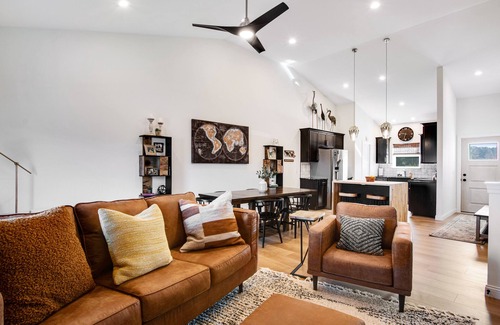 Good times come easy at this modern, stylish home, located right between Wisconsin Dells and Devils Lake State Park .This is a brand new build, completed and cozy on the inside, while the outside is still undergoing some upcoming finishing touches. To enjoy the outdoors take a step across the street to the welcoming, spacious community park on a beautiful day. This home offers multiple walls featuring forest murals create a calm atmosphere, only enhanced by the gas fireplace and comfortable furniture at every turn. Don't fear, summer guests - there's central air conditioning in place for your comfort. The lowest level lounge features a deluxe corner sofa for long nights of chatting and games. The semi-open kitchen features full-size appliances and stylish modern cabinets. If you're in the mood for fresh air, the private gas grill will aid in your vacation grill plans. All bedrooms are upstairs, so everyone can go to bed on their own schedule while everyone stays up late chatting in front of the fire.