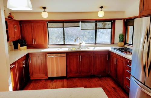 This home is the ultimate River House with high ceiling and wall to wall windows over looking all the glorious mountains views. This home sits on 7 acres with beautiful trails to the river. Upon entering the home you will be greeted by beautiful bright vaulted ceilings over looking the mountains all around. All furnishings are all of which set that "mountain modern" vibe for this home in the woods. This House was remodeled with all the amenities - Smart TV, satellite Direct TV cable, WiFi (Please note that the wifi is a hit and miss for this location as we are in a rural part of town) ,cordless phone, BluRay Player. It has 3 Bedroom and 2 bathrooms, and also a Sun Room with a Futon. All spaces have been curated with modern furniture creating a calm and relaxing environment to sleep that stress away. All new Real Wood Floors installed throughout, beautifully stained. All new tile in the bathrooms with floating vanities. Freshly painted. The master bathroom has a rain shower head with a large seating bench. The Kitchen was completely remodeled with all new Stainless Steel Appliances, with a Wolf Stove. The House has central AC / Heat. It has a washer/dryer. The property has its own beautiful trails to enjoy. Please also note that we do have exterior cameras to protect our property as no one lives on site. The Sunroom also acts as a game room with a foosball table , arcades of pacman and marvel x-men.