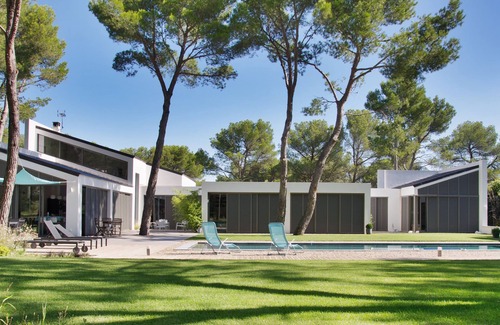 Located in the pretty Provencal village of Lambesc, 18 km from Aix en Provence, we offer our contemporary house of 280 m2 bathed in light, opening onto the garden and the 17 m long swimming pool. Quietly and in the shade of a 7400 m2 pine forest, you can sit and let yourself be carried away by the song of the cicadas.
