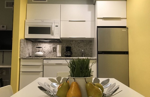 The compact kitchen has a medium-sized refrigerator, microwave, cook-top and cooking basics, dishes and silverware, tea kettle, blender and a dishwasher. There's also a dining area to enjoy a nice meal just as you would in your home. Fresh linens and towels are also provided. The cozy living room is equipped with an LED TV and has a three-seat sofa that opens up and becomes the second bed. Fast internet included and free parking. The bedroom also has an LED TV and a very comfy king size bed - waiting for you to snooze the night away after a fun day out.