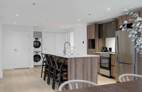 This three bedrooms, two full bathrooms and 1 powder room apartment is sleek, modern and bright with all the pleasant comforts of home, including en-suite laundry, black out curtains, a fully equipped kitchen so you can whip up something delicious with all those local products from the Marché, and a small dining area for four. As a bonus, there’s also a bathtub pour que tu relaxes bien dans le bain.