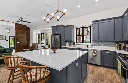 The modern and well-stocked kitchen is a chef's dream. The kitchen boasts ample counter space and is equipped with high-quality appliances, such as an Electrolux Induction Cooktop and Oven, an Electrolux Dishwasher, Electrolux Microwave and vent, Samsung 36' French Door Refrigerator with Beverage Center (featuring an auto-fill pitcher and dual ice maker), Bodega Wine Cooler, toaster, and Keurig. The kitchen table seats four and there are additional counter stools at the center island.