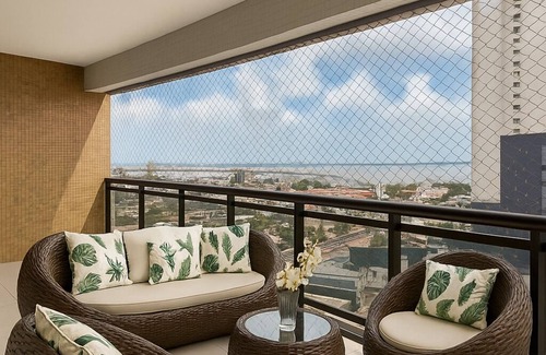 The apartment, with only two units per floor, features a spacious living and dining room, a large balcony with views of the Guajará Bay, a guest bathroom, functional kitchen, service area, full maid’s quarters, Wi-Fi, and 3 parking spaces. Fully furnished and air-conditioned (living room and bedrooms), it comfortably accommodates up to 7 people, offering 3 double beds and 1 single bed in the suites. If needed, there are two large sofa beds in the living room to accommodate additional guests.
