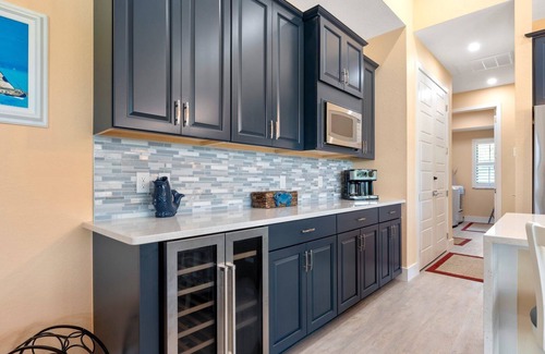 As you enter the Great room, you will be captivated by the soaring Tray Ceilings with built in Mood Light and the sun-drenched split floorplan with open Pool Views. Enjoy the new wood plank vinyl flooring thru-out the whole house. Dramatic Kitchen with 3cm Phoenix Diamond QUARTZ, with waterfall left & right of island, great breakfast bar with 4 white barstools, lots of counter space, pantry with wood shelving, stainless steel appliances, upgrade navy blue cabinetry, soft close doors and drawers, integrated microwave, WINE REFRIGERATOR and tile backsplash. Formal dining with a dining set for 6 just steps away with open views to pool area and large backyard. Entertain with ease as the flow out to the lanai has 3 stacking sliders on one side and a 90-degree slider on the other so you can bring the outside in. Large 260 SFT covered lanai with privacy wall, 2 ceiling fans great outdoor dining set, a comfy seating lounge plus sun loungers. Large pool with rectangular Sunshelf, Italian glass tiles, outdoor shower, embedded in oversized paver deck. Organic wooden barn door separating Owner Suite from main living. Coastal King Bed, nightstands and dresser, walk-in-closet, en-suite dramatic bath with his and hers separate granite vanities, a walk-around-shower and are yours to enjoy as well.